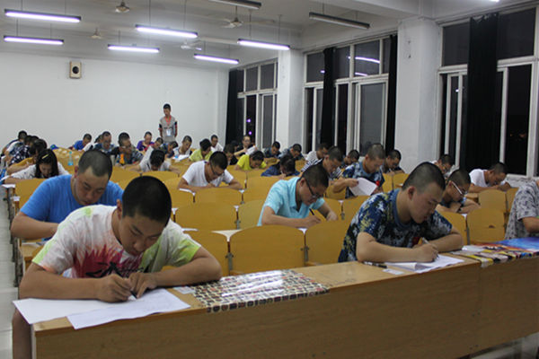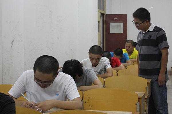 复习之前,毛老师与周老师就数学考试的题型对同学们进行了说明。鼓励同学们进行有目的地复习,并提出自己复习遇到的问题和有利于复习的建议。在新生班主任的陪同下,新生们全身心的投入到紧张的复习当中,新生们奋笔疾书,偶尔小声讨论。每位新生都在为数学考试而奋斗着。新生们在紧张的复习,新生班主任也在耐心细致地为他们讲解复习过程中遇到的难题。整个教室呈现出一种紧张忙碌的氛围。