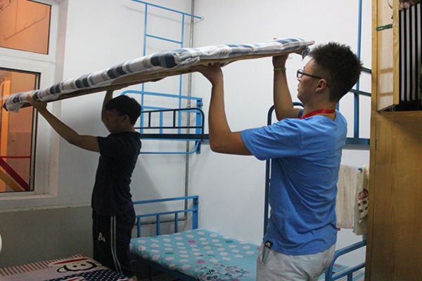 在学生会副主席李恒祺,徐幸的带领下学生会成员按事先分配好的名单进入新生宿舍,对新生给予帮助与指导。 在他们的帮助下,新生开始进行拆床板,擦玻璃 ,擦地,擦桌子,同学们勤快敏捷,经过打扫后宿舍焕然一新,窗明几净。学生会成员尽职尽责地为新生打扫,在他们的感染下新生们也勤勤恳恳。