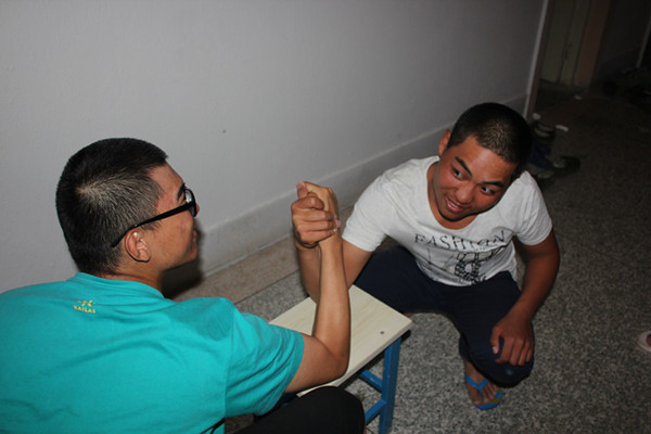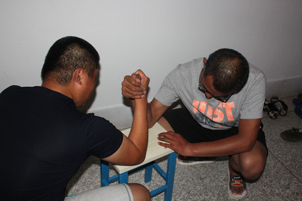 比赛以班级为单位,每个班级内部通过比赛选出掰手腕最厉害的三人,然后经过班级与班级之间抽签决定比赛对手。新生们都显得异常兴奋,比赛的选手卯足了劲,你来我往久久僵持着,难以分出胜负。旁边加油的同学也在紧张的观看着比赛,加油声此起彼伏。紧张激烈的比赛迎来了一阵又一阵欢呼,最后在一声哨响下比赛圆满结束。