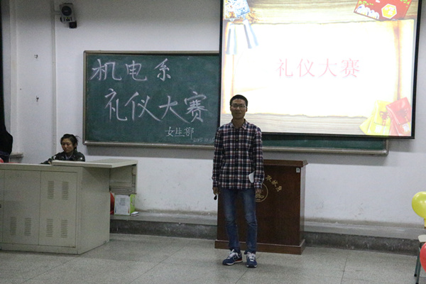 为提高同学们的文明修养,增强同学们的道德素质。机电系于10月15日19:30在主楼511举办新生礼仪大赛。机电系团总支学生会副主席李恒祺、徐幸,14级十佳歌手冠军、礼仪队优秀学员董雪涵、女生部部长陈冉、副部长刘源桢、许玮担任本次比赛评委。部分部长作为嘉宾参与了本次大赛。