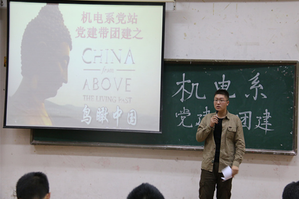 为深化现代大学生道德建设,进一步增强现代大学生的爱国情怀。同时响应我院“中华人民共和国成立66周年”的主题思想。机电系党员工作站特于10月22日19:00在主西一举行党建带团建系列教育活动之“鸟瞰中国”纪录片观赏。机电系第一党支部的同学参加本次活动。