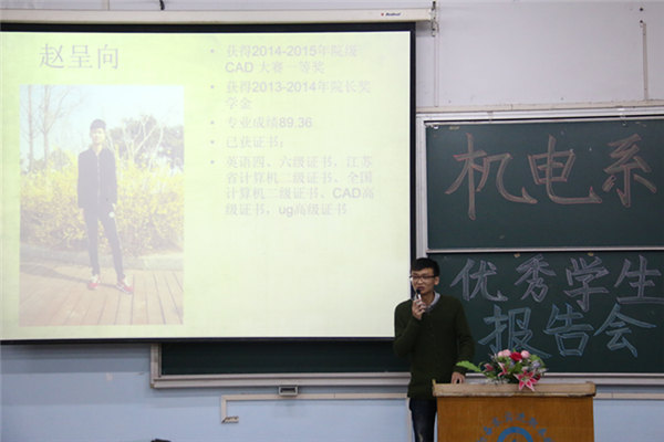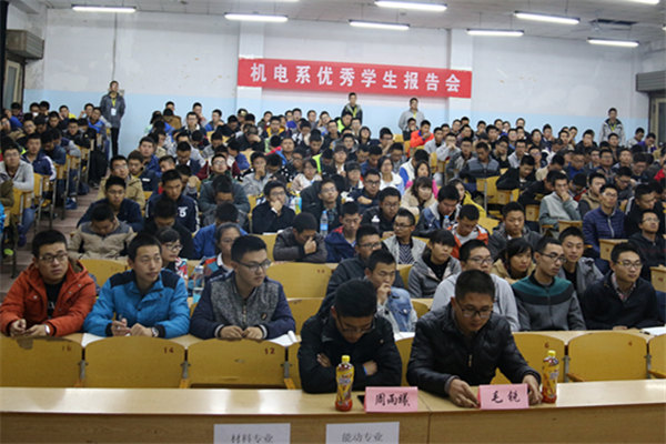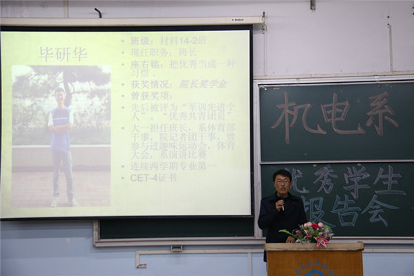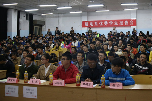 11月6日19:00,机电系在一南101举办优秀学生报告会。学生会指导老师、15级新生辅导员周雨曦老师,15级新生辅导员毛锐老师出席了本次会议。优秀学生代表王振国、赵呈向、朱然、毕研华、张习及15级全体新生参与本次会议。