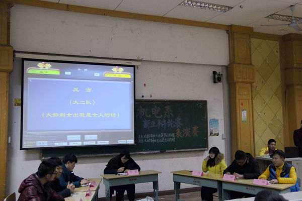 赛前,辩论赛主席介绍比赛规则、会场纪律并指出本次辩题:“大龄剩女出现是男人错还是女人错”。紧接着比赛正式开始,双方辩手用诙谐幽默的自我介绍引出本方观点。比赛过程异常激烈,一辩开篇立论,二辩彼此反驳,双方辩手你来我往,侃侃而谈。其中正方二辩选手灵敏的思维和缜密的逻辑,赢得场下阵阵掌声。随后的自由辩论阶段双方辩手针锋相对、步步紧逼比赛进入白热化阶段。最后双方三辩进行总结陈词,他们就己方观点进行总结对反方观点进行反驳,他们高度概括性的陈词赢得场上阵阵掌声。辩论赛开幕式也在这阵阵掌声中圆满落幕。
