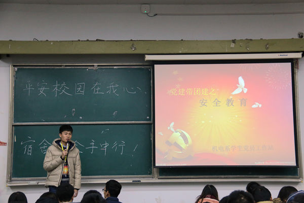 机电系党员工作站为了提高同学们的校园安全意识,机电系党站于11月26日晚21:00在主北四举行安全教育活动。系党站站长马昱恒、副站长梅寒霜、组织部全体成员及大一各班班委和室长参加了此次活动。