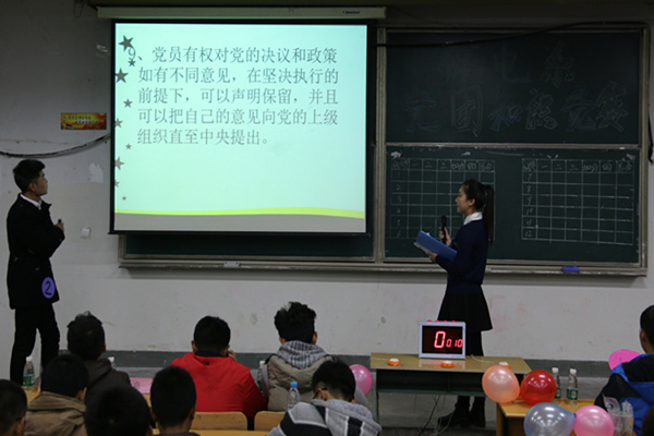 为引导广大同学了解党史党章,团情团训,进一步促进同学们学习党团知识的积极性,保持党员团员创生争优的意识。机电系于11月29日19:00在主南二举行党团知识竞赛复赛。系团总支副书记王振国,学生会副主席姜靖宇、潘成担任本次比赛嘉宾。