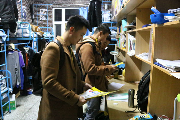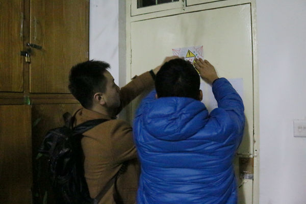 本次活动将安全教育同“党员下宿舍”相结合,通过安全知识教育活动中评选出的优秀标语,经过精心设计,然后由党员们到各个新生宿舍进行张贴。党员们在帮助同学们张贴安全提醒标语的同时,恰当地给他们讲了一些消防安全知识和预防灾害发生的措施,并强化了他们的安全意识。
