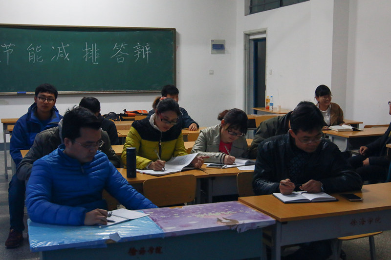 答辩会以演讲的形式进行。参加答辩队伍每队派出一名代表,通过ppt或口述的形式对参赛作品进行解说。他们从自己的创作灵感、设计理念、设计思路,作品的创新性、节能性、实用性、未来的发展情况等方面进行了详细的说明。在听完各代表的介绍后,老师们就这些设计进行提问,指出了他们在设计中存在的不足,给出了相应的解决办法并就设计作品的节能减排性、可操作性给出了详细的建议。同学们准备充分,解说精彩纷呈,设计类型丰富多彩,其中键盘能量回收、家庭作坊以及农村采暖炉等设计得到老师的一致好评。