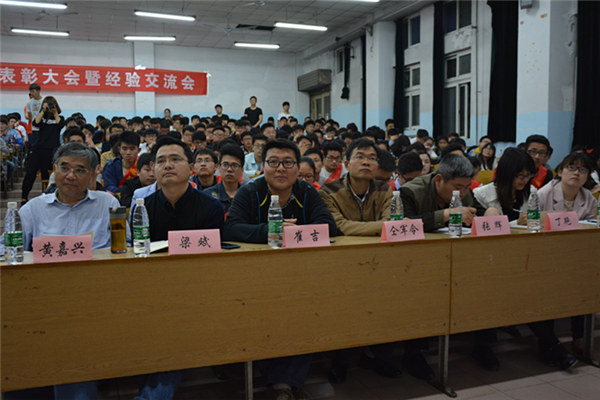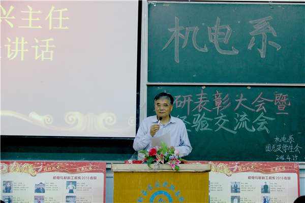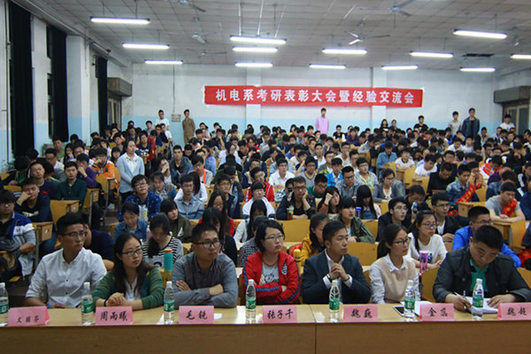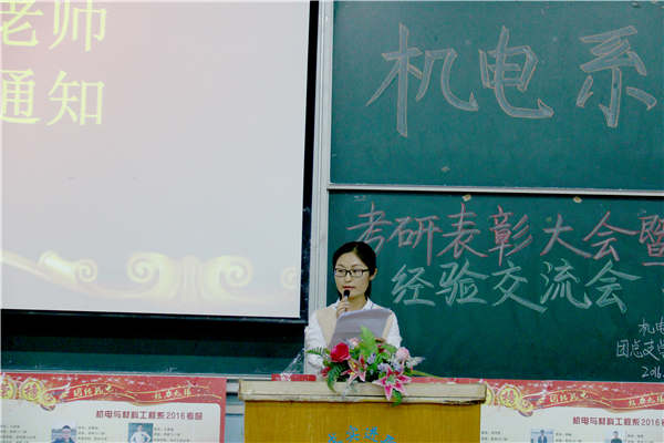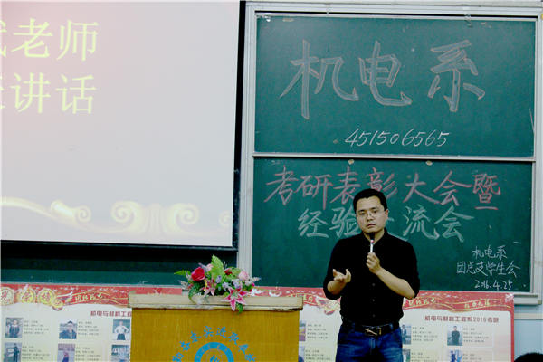 为表彰先进,树立典型,进一步调动广大同学考研热情。机电系于4月25日19:00在教一南101教室召开2016届考研表彰大会暨经验交流会。机电系主任黄嘉兴老师、副主任魏超老师,学工办主任金蕊老师,系务秘书文丽芬老师,辅导员魏巍、张子千、毛锐、周雨曦老师,专业教师张辉、崔吉、丁艳、梁斌、仝军令、上官云娟老师出席本次会议,受表彰同学及机电系2013级、2014级有考研意向的300多名同学参加会议。
