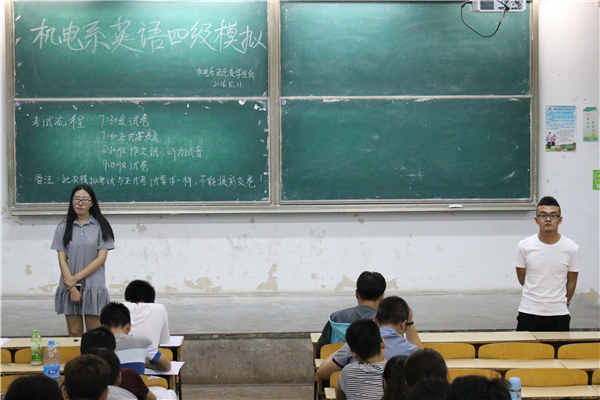 为提高同学们对于英语四级考试流程的了解,使参加四级考试的同学们尽早进入积极备考的状态,提高应考心理素质,在考试时能够正常发挥水平,机电系于5月11日19:30在主南一、主南二、主北一组织了大学英语四级模拟考试。