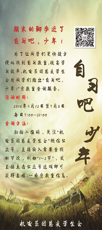 为方便我院同学快捷查询空教室位置,进一步提高学习效率和成绩。机电系于5月13日起为全院同学们推出“自习吧,少年!”教室查询服务。 全院同学通过关注<机电系团总支学生会>官方微信公众号,发送所需查询的节次即可查询到空教室位置。自此项查询服务推出以来,吸引了广大同学的热情参与。 本次活动,有利于方便广大同学方便、快捷的查询空教室,有利于提高同学们的学习效率和成绩,同时对进一步提高我院学风建设具有重要意义。