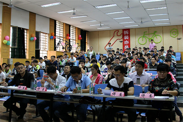 本次比赛共分为拆卸、组装和整体测试三个环节。第一环节,6支参赛队伍通过抽签方式分为两组分别上台参加比赛,每组选手需在8分钟内完成自行车拆卸,比赛过程中秋名山车队和城管大队略胜一筹,分别在第一第二组参赛队伍中率先完成。第二环节自行车组装,每组选手需在15分钟之内完成组装,评委根据先后顺序进行加分。第三环节是整体测试,各评委老师上台对组装好的自行车进行测试并就车辆的拆装情况扣除相应分数。比赛期间,参赛选手团结协作,紧张有序的进行各部件的拆卸与组装,将理论基础与动手实践能力发挥的淋漓尽致,赢得全场阵阵掌声。评委老师专业、细致的对各支队伍拆装的自行车进行检验和打分,充分体现出比赛的公平、公正。互动环节更是精彩纷呈,在各组队员进行拆卸的同时,我系3D协会会长彭聪为大家演示了自行车三维软件绘制过程以及螺母的绘制过程,他娴熟的操作更是将现场氛围推向另一个高潮。经过激烈角逐,最终城管大队、秋名山队、红叶队分别取得一二三名。活动接近尾声,黄嘉兴主任就活动举办的意义、目的和如何提高综合实践能力等方面做出总结性发言。同时他对本次比赛给予了肯定,并对我系同学给予殷切期望。