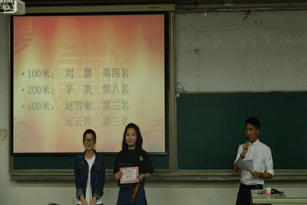 大会伊始,体育部部长陈俊对此次运动会进行总结,他肯定了运动员们所取得的成绩,对运动会期间运动员们永不服输,团结拼搏,力争上游的精神给予表扬。随后,体育部分管主席程皓代表发言,他首先对所有运动员所付出的努力表示深深的感谢,他希望运动员们能够将这种勇于拼搏,吃苦耐劳,团结一致的精神传递下去,在明年运动会上“保二争一”。最后,在欢快的氛围中,主席及部长为各位获奖运动员颁奖并合影留念。