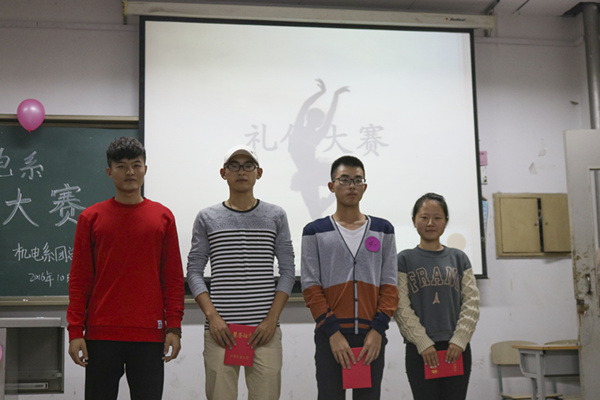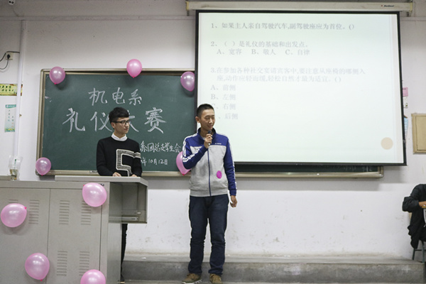 为了使新生注重文明修养和待人礼节,机电系于10月12日19:00在主楼211举办新生礼仪大赛,机电系团总支副书记李嘉华、学生会主席徐幸、副主席彭聪、陶帅出席本次大赛,学生会副主席毕英梅、艺术团礼仪队刘备、张昭、董孟博担任比赛评委。
