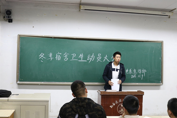 关于冬季寝室卫生事宜,陈俊及秦占斌详细讲解了宿舍卫生所存在的问题问题,提出现如今已进入冬天,宿舍有异味,不能怕冷就封闭空间,宿舍里要多通风,防止生病,要勤打扫。之后又对各种卫生问题进行了说明,督促同学们要注意宿舍卫生。同时也叮嘱大家在宿舍日常生活中注意安全用电,杜绝使用热得快、电饭锅、电热杯等大功率电器,严禁使用明火,离开宿舍时要切断电源。对于男生,更是叮嘱大家不要在宿舍吸烟,彻底根除火灾隐患。最后,此次冬季宿舍卫生动员大会在同学们的掌声中结束。