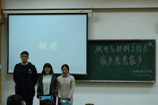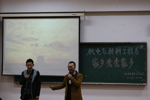 11月15日,机电系于主西一举办家乡秀活动。创新创业基地创业部部长程天佑,院学生会女生部部长沈凯平,机电系团总支学生会科技创新部部长吴子祥,心理健康部部长吴舜禹担任此次活动的评委。机电系团总支副书记李嘉华,系学生会主席徐幸,副主席陈俊、彭聪出席本次活动。