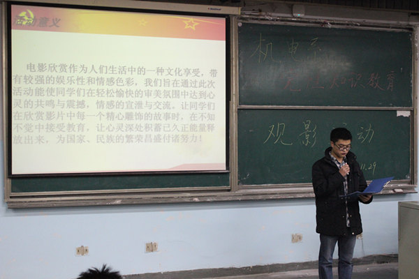 11月29日,晚上7点,为了让同学们真正领会优秀的共产党人为了中华民族繁荣富强倾心付诸的心血,机电系党站在主东二举办红色党史观影——《建党伟业》活动,机电系全体中党、高党参加了此次活动。
