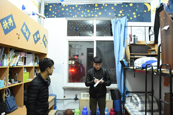 在生活部和女生部部长的带领下,分两组同时展开。一组检查学24、学17宿舍楼,二组检查学1宿舍楼。检查主要针对床铺整洁、地面卫生、物品的摆放等方面进行综合评分,对未达标的宿舍进行具体登记并进行指导与适当调整,对优秀宿舍和达标宿舍给予表扬。检查过程中干事们认真负责,宿舍成员们也积极配合,整个检查气氛融恰。