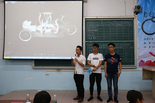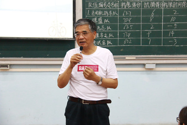 拆装组比赛共分为拆卸、组装和整体测试三个环节。第一项第一环节,5支参赛队伍上台参加比赛,每组选手需在15分钟内完成自行车拆卸,比赛过程中,第二组参赛队伍率先完成。第二环节自行车组装,每组选手需在15分钟之内完成组装,评委根据先后顺序进行加分,第四组与第二组率先完成。第三环节是整体测试,各评委老师上台对组装好的自行车进行测试并就车辆的拆装情况扣除相应分数。比赛期间,参赛选手团结协作,紧张有序的进行各部件的拆卸与组装,将理论基础与动手实践能力发挥的淋漓尽致,赢得全场阵阵掌声。评委老师专业、细致的对各支队伍拆装的自行车进行检验和打分,充分体现出比赛的合理、公平、公正。接下来第二项,由改装组的每组队伍进行限时三分钟的ppt演讲然后并进行答辩。经过激烈的比拼,最终获得优胜奖的是 hangs and practical队、张无忌队、拆迁大队和考试全过队, 获得三等奖的是 超级无敌炫酷队和老司机拆车队, 获得二等奖的是 强盛队和plus队, 获得一等奖的是技高一筹队和不匿名之队 。在活动接近尾声时,黄嘉兴教授就活动举办的意义、目的和如何提高综合实践能力以及结合自身的亲身经历与体验等方面做出总结性发言。同时他对本次比赛给予了充分肯定,并对我系同学给予殷切的期望。