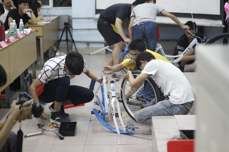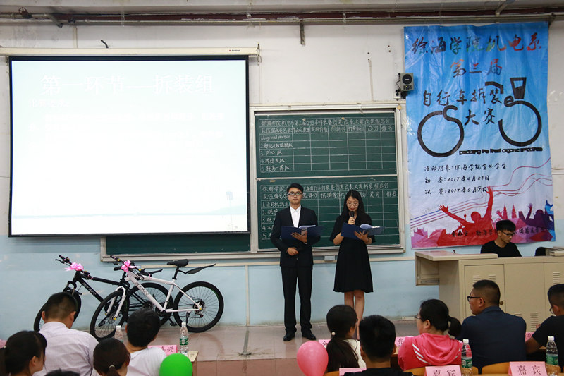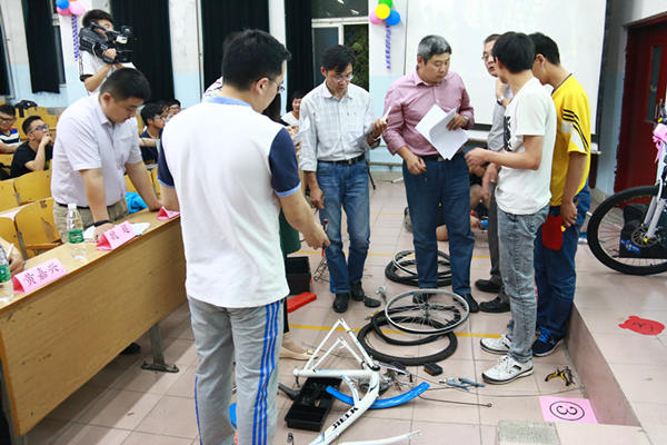 拆装亦是创造,疯狂创造奇迹。5月15日19:00机电系第三届自行车拆装暨创意改装大赛在一南101隆重举办。出席此次大赛的嘉宾有机电系主任黄嘉兴教授,学工办主任金蕊,辅导员张子千、毛锐、周雨曦老师及院系主席们。机电系副主任魏超老师,机电系教研室张辉、丁艳、梁斌、仝军令及杨博老师担任比赛评委。