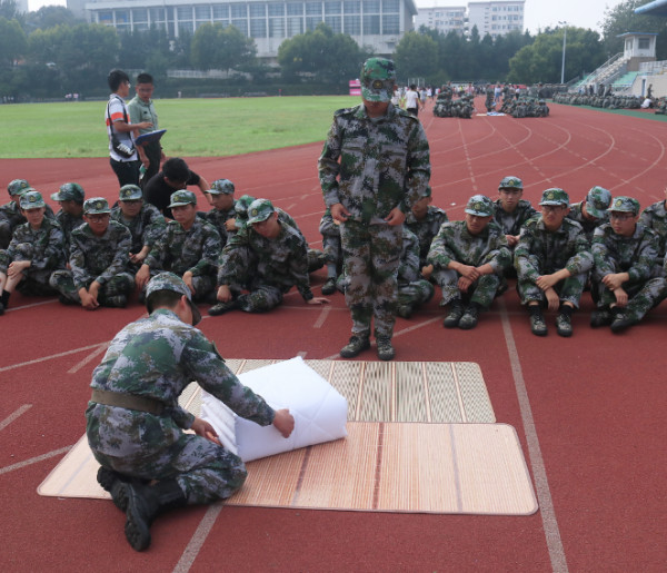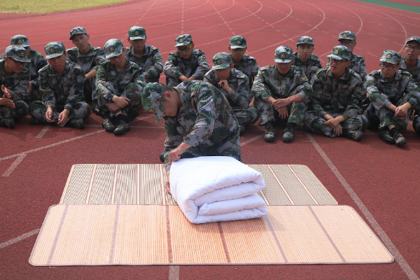 随着一声哨响,比赛开始,参赛的同学们争分夺秒,迅速的铺好被子,动作麻利有序。同学们先是用胳膊一次次碾过被子,力求使被子平整。接着一只手不动,用另一只手拇指和食指中指的力量把线条按出来。最后用一只手食指跟拇指捏住一角,然后从底部沿着边沿捋到尽头。过程不断的重复,直到被子边缘整齐为止。教官在参赛同学之间来回走动,提醒着同学们注意细节。赛场紧张激烈的情绪很快的感染了其他正在备赛的同学们,他们一个个摩拳擦掌、跃跃欲试。最终比赛在又一声哨响中结束,那一床床叠的像豆腐块一样的被子,受到周老师和各新生班主任们的一致好评。