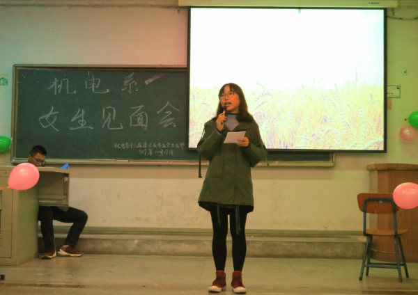 为了增强女生之间的相互了解认识,丰富女生们的课余生活,增强她们的安全意识,机电系于10月17日19:00在主楼206举行女生见面会,机电系第十二届团总支学生会主席班昂,副主席路展,邱云霞,张秦意,戴宏明,刘慧作为嘉宾出席本次见面会。机电系 17级全体女生参加了本次活动。