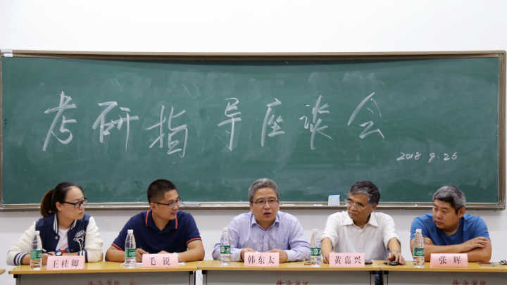 会议开始,韩东太教授就考研的报考,考试,面试以及入学方面分享了丰富的经验,指出考生们需要避免的误区,分析了国家最新的考研资讯。同时指出当前大学生严峻的就业形势,说明了考研的必要性。黄嘉兴主任根据考生们自身情况分析考研前景,希望考生们能把自己的目标定高一些,端正自己的态度,发现差距,拓展知识面,注意扬长避短。同时指出信心对考研的重要性,并就同学们提出的问题做出了详细的讲解。