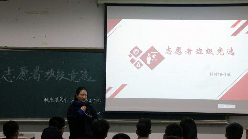 为培养同学们“服务社会,奉献自己”的精神,机电系于10月15日18:30在主楼206开展志愿者班级竞选会,学生会副主席刘颜清、机电系18级各班级代表参加此次竞选会。
