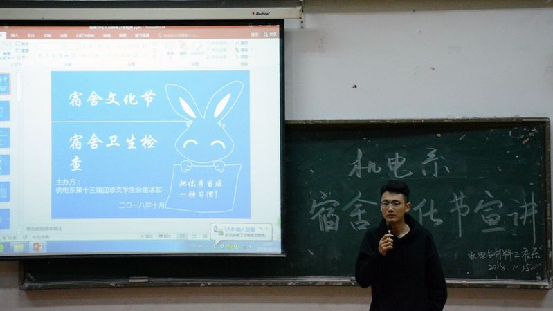 为了促使同学们能养成一个良好发宿舍卫生习惯,同时增添宿舍的温馨感,提高同学们参与宿舍文化节的积极性。机电系于10月15日18:30在主西一召开了宿舍文化节动员大会。学生会副主席郭昊霖,生活部部长黄军、副部长王玉、郑都禹以及18级全体宿舍长及生活委员参加了此次大会。