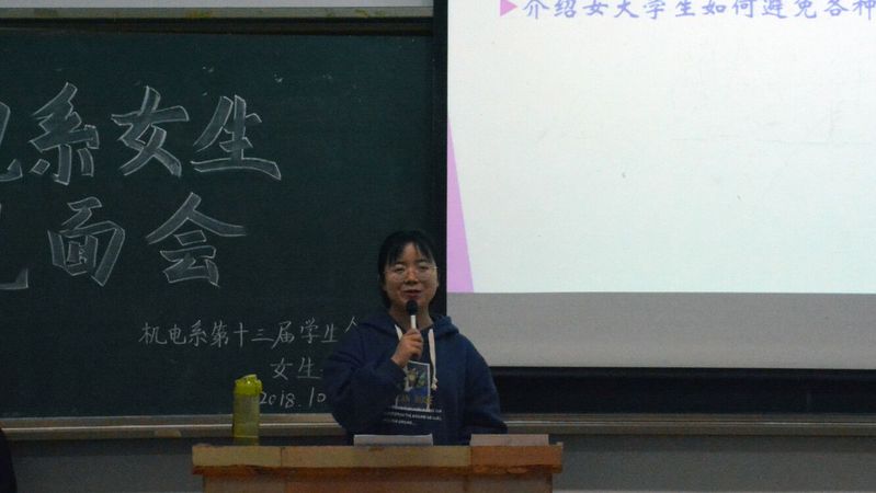 为了增强女生之间的相互了解认识,丰富女生们的课余生活,增强她们的安全意识,机电系于10月16日19:00在主楼206举办女生见面会,系学生会副主席陈涵嫣,新生班主任汤晨作为嘉宾出席本次活动。18级全体女生参加了本次活动。